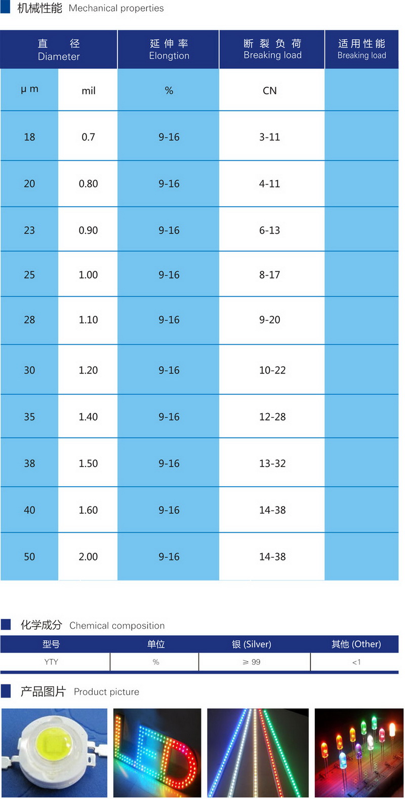 YTY银丝 日期:2017-01-13 / 人气: / 来源:未知 YTY银丝键合银丝是专门针对各种LED发光管封装而研发的LED银键合丝。 经过添加微量元素以及特殊的工艺处理,提高银的高度,性能稳定。 上一篇:没有了 ← 返回 下一篇:没有了 →